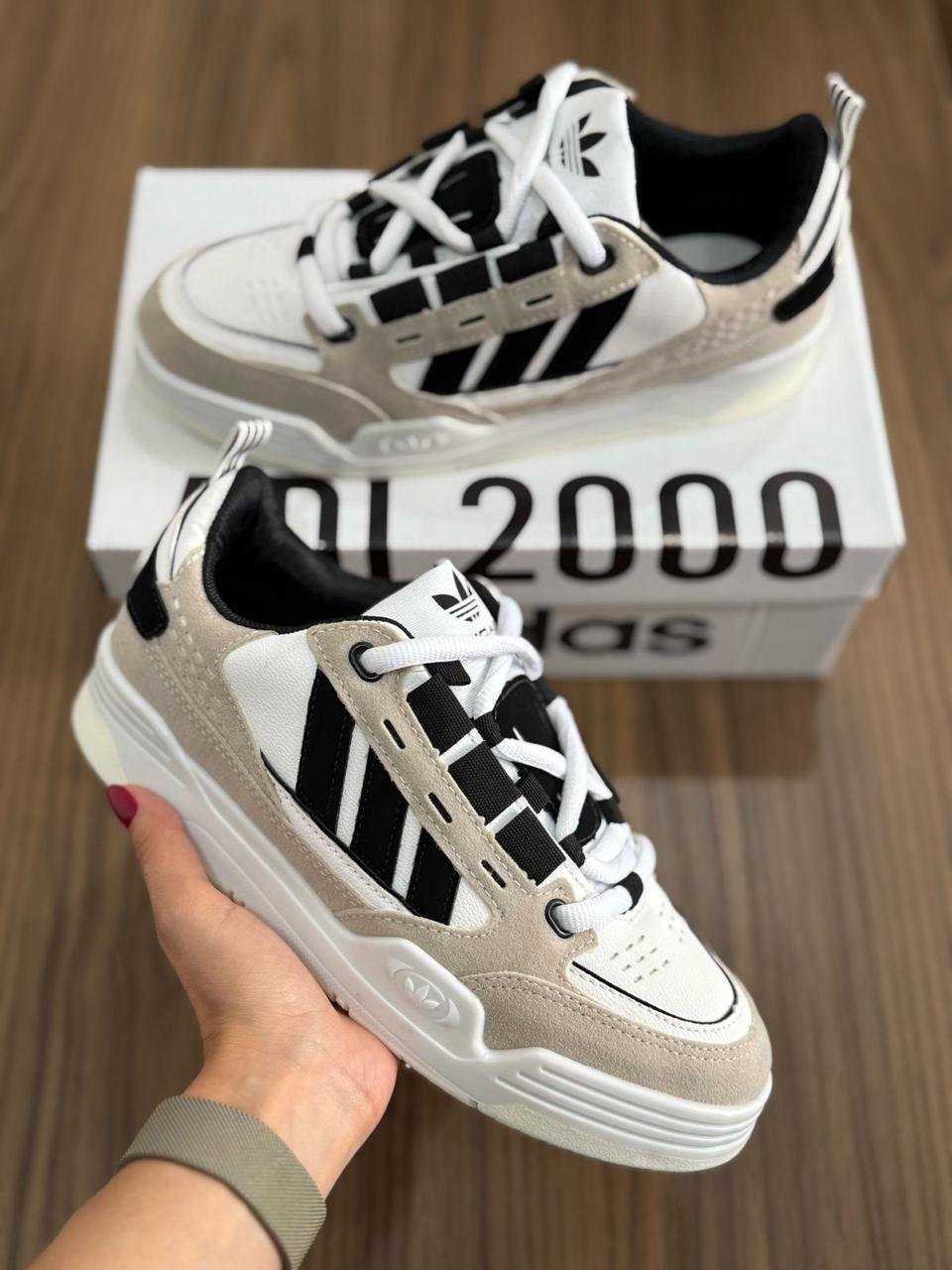 Las Adi2000 Neutral Vibe fusionan tonos cálidos y neutros con detalles clásicos para un look urbano refinado. La parte superior combina el beige suave con paneles blancos, creando una base armoniosa y versátil. Las tres lÃneas negras, junto con los detalles oscuros, aportan contraste y profundidad al diseño. Los cordones y la suela blanca completan esta silueta limpia, ideal para quienes buscan estilo sin esfuerzo y una estética contemporánea con raÃces retro.