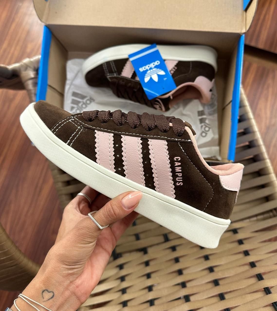 Las Adidas Campus00s Coffee Pink Suede combinan lo clásico con un giro contemporáneo. Su parte superior de gamuza color café ofrece una base elegante, mientras que la lÃnea rosada y la suela blanca añaden un contraste fresco y vibrante. Perfectas para quienes buscan un calzado que se distinga, pero mantenga la esencia retro. Campus00s Coffee Pink Suede: un diseño único que fusiona comodidad, estilo y actitud con un toque de color inesperado.
