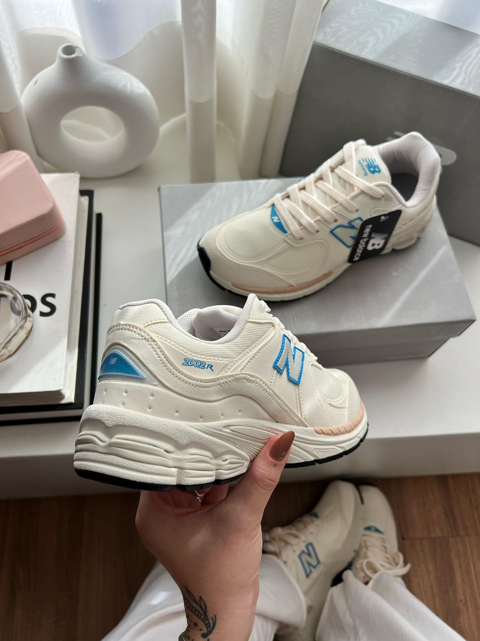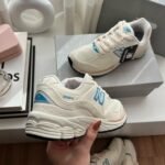 Las New Balance 2002R en blanco con detalles en rosa y el icónico logo en celeste ofrecen una versión fresca y delicada de este clásico del calzado urbano. Su parte superior, construida en una mezcla de malla y cuero sintético de alta calidad, brinda transpirabilidad y soporte con un acabado limpio y moderno. La suela blanca con tecnologÃa ABZORB y N-ergy proporciona amortiguación superior y una pisada suave. Los sutiles toques en rosa pastel y el logo azul celeste agregan un acento de color que eleva el diseño sin perder su esencia minimalista.