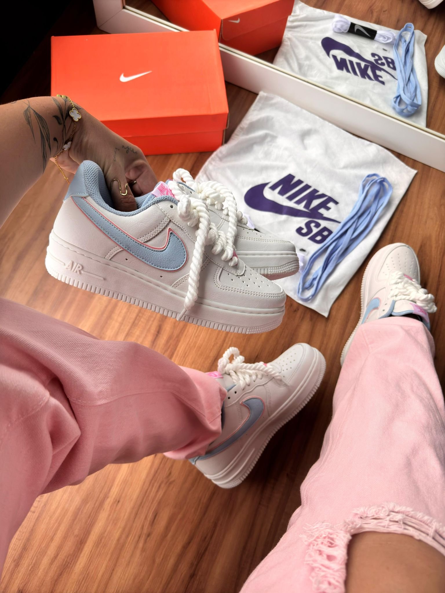 Minimalismo con un toque mágico. Estas Nike Air Force 1 se visten de blanco de pies a cabeza, con cordones tipo cuerda que aportan textura y estilo. Lo que realmente llama la atención es el logo en celeste, rodeado por un contorno rosado que da la impresión de un brillo sutil, como un resplandor en movimiento. Una mezcla perfecta entre lo clásico y lo creativo, pensadas para destacar sin perder la elegancia.