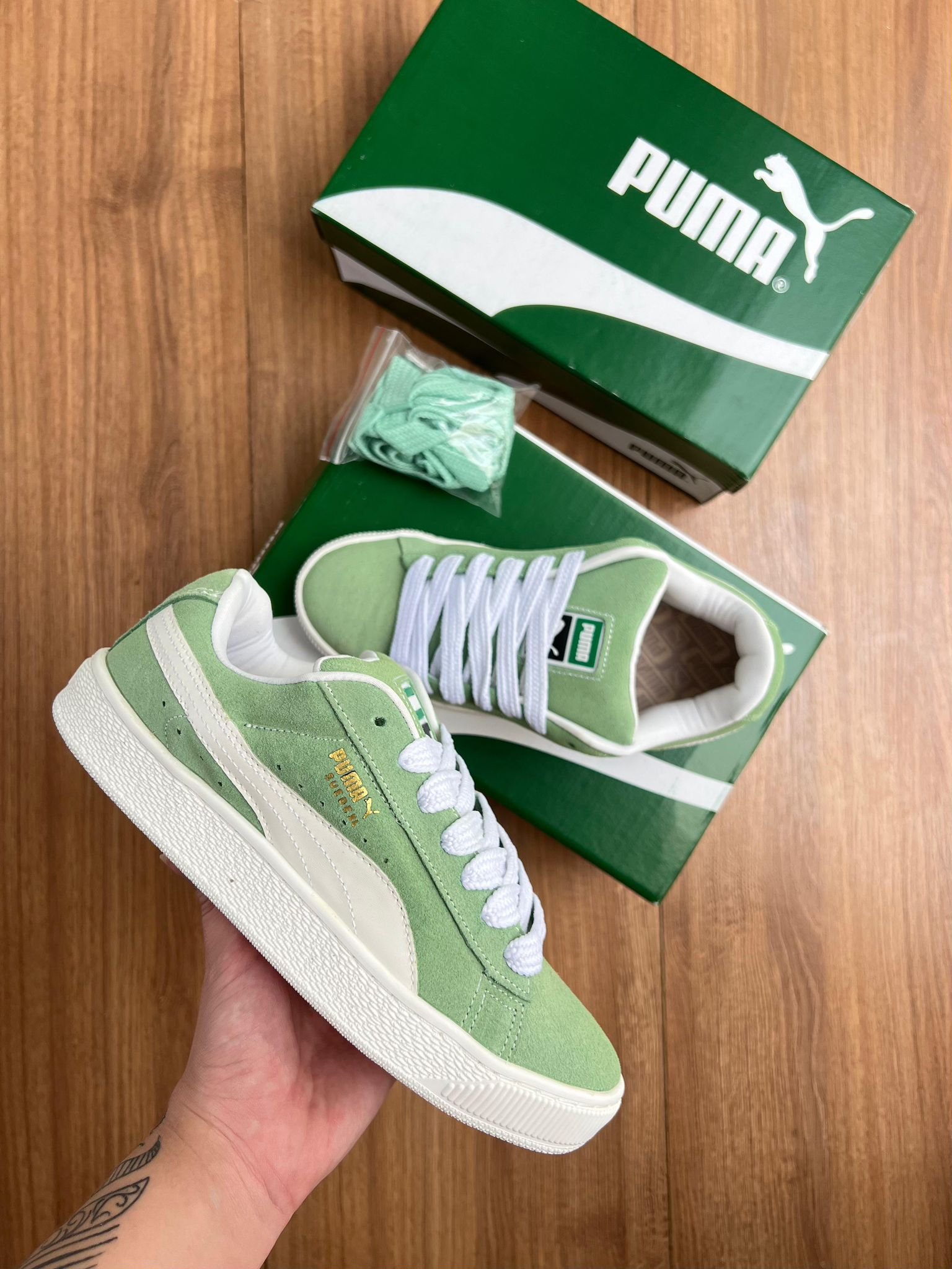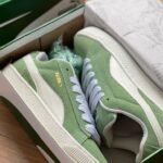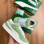 Frescura atemporal y estilo urbano se encuentran en las Puma Suede XL “Mint Fade”. Su parte superior de gamuza en un verde suave aporta una vibra relajada y natural, mientras que los detalles en blanco —cordones, suela y logo resaltan con un contraste limpio y moderno. Con su silueta robusta y alma retro, estas zapatillas son ideales para quienes quieren destacar con elegancia sin esfuerzo. Un clásico renovado para el día a día.